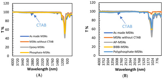 FTIR data for synthesized material: (A) phosphate-MSNs, (B) polyphosphate-MSNs.