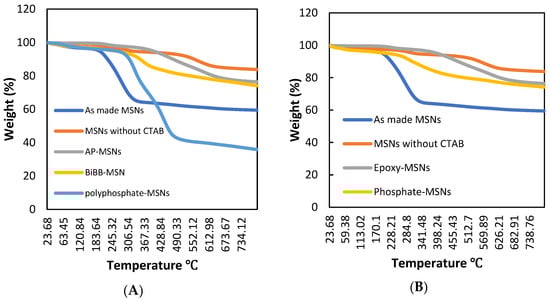 TGA data for synthesized material; (A) phosphate-MSNs, (B) polyphosphate-MSNs.