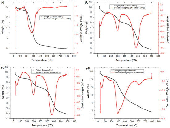TGA and DTG thermograms illustrating the correlation between mass loss rate and temperature for material (A) phosphate-MSNs: (a) as-made MSNs; (b) MSNs without CTAB; (c) epoxy-MSNs; (d) Phosphate-MSNs.