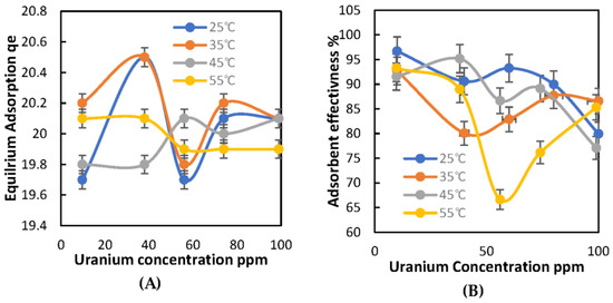 The Influence of temperature on the adsorbent: (A) equilibrium adsorption qe (mg/g) against U concentration; (B) adsorption effectiveness % as a function of U Concentration ppm.