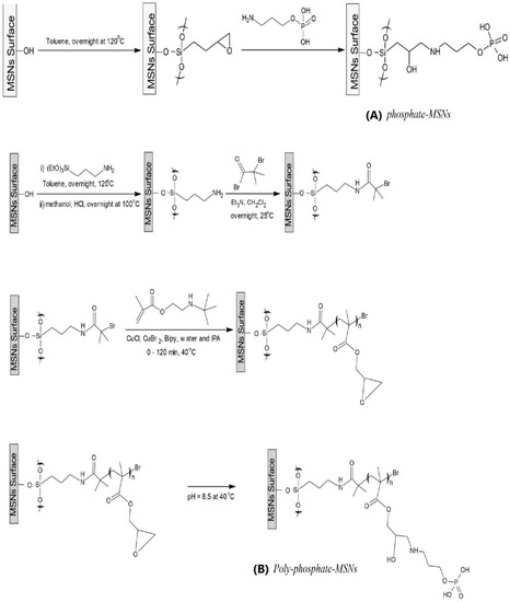Surface adjustment of mesoporous silica nanoparticles (MSNs) with: (A) phosphate-MSNs, (B) polyphosphate-MSNs.