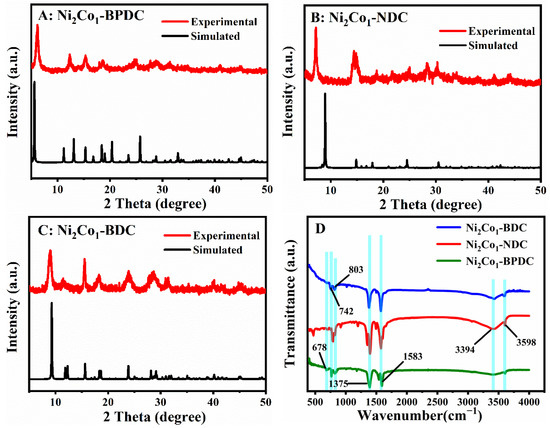 (A–C) XRD patterns of Ni2Co1-L MOFs. (D) FTIR spectra of Ni2Co1-L MOFs.