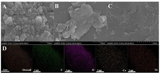 SEM images of Ni2Co1-BPDC (A), Ni2Co1-NDC (B), Ni2Co1-BDC (C). (D) EDS mapping images of Ni2Co1-BDC.