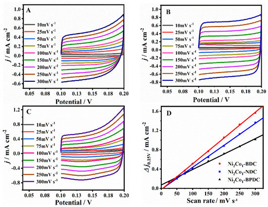 First of all, the electrochemical active areas of different Ni2Co1-L MOF nanosheets were compared by calculating the electric double-layer capacitance (Cdl) based on the CV tests in a non-Faradaic region (e.g., from 0.10 to 0.20 V) [41]. The results are shown in Figure 3A–C. According to the slope of the linear relationship between the capacitive currents difference (Δj = janodic − jcathodic) at 0.15 V and the scan rates (Figure 3D), the Cdl of the Ni2Co1-BPDC/GCE, Ni2Co1-NDC/GCE, and Ni2Co1-BDC/GCE was obtained to be 3.20, 4.65, and 5.35 mF cm−2, respectively. It is known that the Cdl is proportional to the electrochemically active area. The Ni2Co1-BDC/GCE had the largest active area, which may be derived from its 2D lamellar morphology.