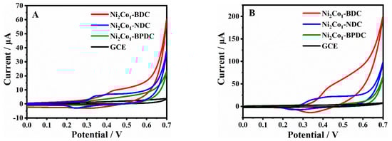 It is well known that one of the key factors affecting the catalytic performance of electrode material is the number of active sites, which can be measured in the electrochemically active region. Here, the electrocatalytic activity of Ni2Co1-L MOFs was compared by recording the CV curves in 0.1 M NaOH at a scan rate of 100 mV/s, and the results are shown in Figure 4A. It is noteworthy that the GCE and Ni2Co1-BPDC/GCE show no obvious redox peak, suggesting poor electrochemical activity. The Ni2Co1-NDC/GCE shows a pair of asymmetric redox peaks at around 0.42 and 0.24 V, and in the CV curves of the Ni2Co1-BDC/GCE more obvious redox peaks appear at around 0.46 and 0.34 V. These redox peaks most likely resulted from the redox of their metal centers Ni2+ and Co2+. Additionally, the Ni2Co1-BDC/GCE has a higher peak current, suggesting the largest number of exposed active sites. Then, glucose was chosen as the target molecule and the catalytic activity of these materials on glucose was investigated. Figure 4B shows the CV curves of different GCEs after the addition of 0.1 mM glucose. No obvious redox peaks were observed on the surfaces of the GCE and Ni2Co1-BPDC/GCE. For the Ni2Co1-NDC/GCE and Ni2Co1-BDC/GCE, both of them show an oxidation peak with enhanced signal compared with Figure 4A without glucose. It was found that the Ni2Co1-BDC/GCE had the most obvious phenomenon, which indicated that it had the strongest catalytic activity for the oxidation of glucose. This can be attributed to the unique disk-like structure of Ni2Co1-BDC, as it exposes more active sites easily, like the results we mentioned above. The electrode reaction mechanism of the redox process can be expressed by the following equation [42]: