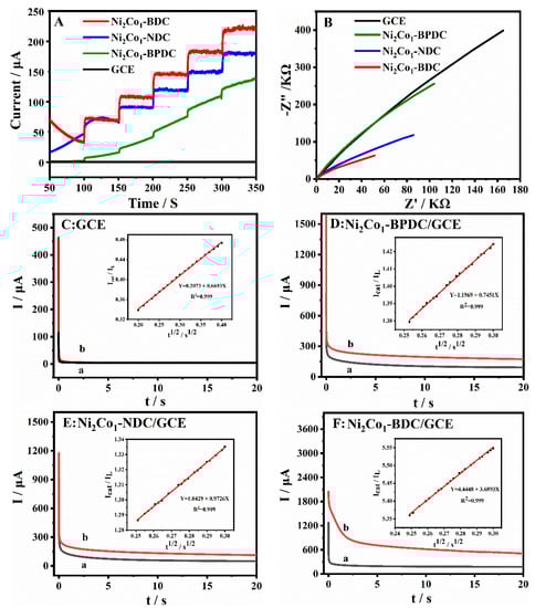 To explore the reason for the signal enhancement effects for the oxidation of glucose, electrochemical impedance spectroscopy (EIS) measurements were employed to investigate the electron transfer resistance of different Ni2Co1-L/GCEs during glucose oxidation. In the Nyquist plot, the semi-circle diameter represents the charge transfer resistance (Rct) for the electrode surface active species [43]. Herein, based on Figure 5B, the fitted values of Rct for the oxidation of glucose on the GCE, Ni2Co1-BPDC/GCE, Ni2Co1-NDC/GCE, and Ni2Co1-BDC/GCE were 85.4, 43.3, 27.2, and 12.0 KΩ, respectively. The greatly decreased Rct values revealed that the Ni2Co1-BDC/GCE improved the electron transfer ability of glucose, consequently resulting in higher oxidation signals.