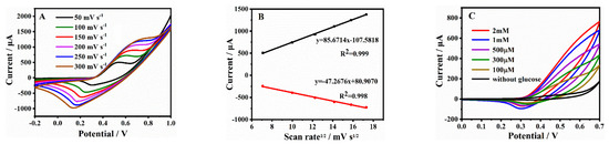To further investigate the reaction kinetic characteristics of the Ni2Co1-BDC/GCE for glucose oxidation, the CV curves of the electrode at different sweep rates (50–300 mV/s) were tested in the NaOH solution containing 0.1 mM glucose (Figure 6A). It can be seen from Figure 6B that both anodic and cathodic peak currents (Ip) increased in proportion to the square root of the scan rates. These results indicated that the electrochemical kinetics were diffusion-controlled. Moreover, the anodic peak potentials (Epa) shifted more positively and the cathodic potentials (Epc) shifted more negatively with increases in scan rates, which suggested the quasi-reversible electrochemical reaction process of the Ni2Co1-BDC on the electrode surface in the majority of activation sites [45]. Figure 6C presents the CVs of the Ni2Co1-BDC/GCE, including various concentrations of glucose. It was found that the peak current density of anodic oxidation increased with the augment of glucose concentration from 0 to 2 mM, which indicated that the Ni2Co1-BDC/GCE had good catalytic performance for glucose oxidation.
