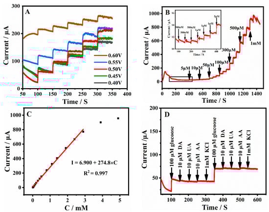 The Ni2Co1-BDC/GCE was used to construct the enzyme-free glucose sensing because of its excellent electrochemical properties. To achieve the optimum sensing performance, the material preparation conditions, such as the effects of the bimetallic type and ratio (Ni, Ni:Co = 1:1, 2:1, 1:2, Co), the type and concentration of the applied base source (NaOH, KOH, TEA, TEAH) on the glucose oxidation signal were optimized. As shown in Figure S2A–C, the strongest current step signal was obtained with the Ni2Co1-BDC/GCE (3 mmol KOH). Then, the test conditions (potential, modification amount, dispersing solvent) were also optimized. As shown in Figure 7A and Figure S2D–F, the strongest current step signal was obtained under the test conditions of the test voltage of 0.50 V, dispersing solvent of DMF, and modification amount of 4 μL (5 μL Nafion).