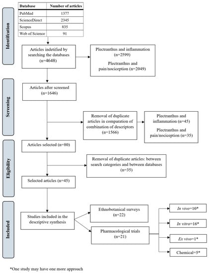 The initial search using all combinations of keywords found 4648, with 2599 reporting Plectranthus and inflammation and 2049 to Plectranthus and pain/nociception (Figure 1). Details on the article search are shown in Table S1. After abstract reading and duplicate exclusion, a total of 43 articles (Figure 1) were included in this review, 22 (51.16%) of which were focused on ethnobotanical surveys, while 21 (48.84%) of them consisted of pharmacological trials.