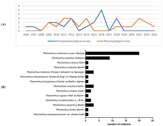 Ethnobotanical surveys data and pharmacological trials: distribution of articles over the years (A) and total number of citations of each eligible Plectranthus species (B) included in this systematic review.