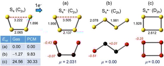(U)PBE0/D3/def2-QZVP optimized geometries (distances in Å) for S4•−, with Mulliken charges (in italics) and dipole moments μ (in Debye). Relative gas phase and PCM (=DMF) corrected total energies Erel are in kJ mol−1.