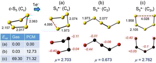 While the structure of neutral S5 is unknown, an open envelope-like or chair shape with Cs symmetry has been predicted in previous studies [,], with the S–S bond bisected by the mirror plane slightly elongated. We concur with this result, and calculate the unique S–S distance = 2.157 Å. The apparent weakening may be attributed, in valence bond parlance, to lone-pair repulsion arising from the eclipsed alignment of the two neighboring S–S bonds. One-electron reduction to the radical anion S5•− leads to a variety of structural alternatives, the most obvious involving complete separation (to 4.095 Å) of the already weakened mirror-bisected linkage, to afford the distorted Cs chair illustrated in Figure 2a. Vibrational analysis confirms that the optimized structure represents a true energetic minimum and, as indicated by the associated Mulliken charge densities, negative charge is heavily localized on the two sulfurs associated with the “broken” bond. As expected, charge polarization, and its impact on the molecular dipole, increases with the inclusion of PCM (Table S1).