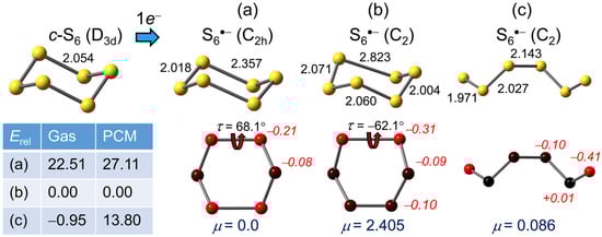 From a theoretical perspective, one-electron reduction of the high-symmetry geometry of neutral S6 gives rise to an orbitally degenerate ground state for the resulting radical anion S6•−. Thus, when using D3h symmetry constraints as a starting point for a geometry optimization, the symmetric chair immediately breaks symmetry and undergoes a first-order Jahn–Teller distortion [] to C2h symmetry, affording two elongated S–S bonds, calculated here = 2.357 Å (Figure 3a), somewhat shorter than that observed experimentally. However, as observed earlier, while this centrosymmetric C2h structure represents a stationary point it is not an energy minimum. Upon release of symmetry constraints, it undergoes a second-order distortion to the C2 modification (Figure 3b), in which one of the two elongated S–S bonds in the C2h geometry stretches further to 2.823 Å, a result in accord with the earlier DFT work []. By our calculations the energy difference between the C2h and C2 structures is large (22.5 kJ mol−1), even in the gas phase, and increases to 27.5 kJ mol−1 with the inclusion of PCM (μ = 0 in the C2h form).