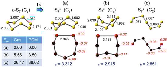 (U)PBE0/D3/def2-QZVP optimized geometries (distances in Å) for S7•−, with Mulliken charges (in italics) and dipole moments (μ) in Debye. Relative gas phase and PCM (=DMF) corrected total energies Erel are in kJ mol−1.