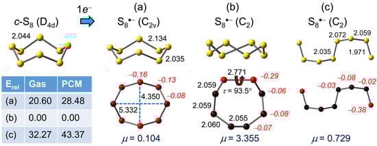 (U)PBE0/D3/def2-QZVP optimized geometries (distances in Å) for S8•−, with Mulliken charges (in italics) and dipole moments (μ) in Debye. Relative gas phase and PCM (=DMF) corrected total energies Erel are in kJ mol−1.