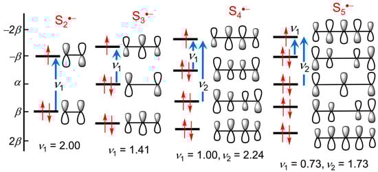 The TD-DFT calculations refine the qualitative predictions of the HMO model, confirming the nature of the expected transitions (Figure 7) and affording numerical estimates for the π → π* excitation energies involved for both the cis (C2v) and trans (C2h) isomers. Calculated spectra for Sn•− (n = 2–4) are shown in Figure 8.
