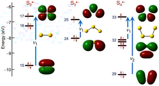 The origin of the electronic excitations in the short-chain radical anions Sn•− (n = 2–4) can be readily understood with reference to the manifold of π-orbitals predicted by the classical Hückel molecular orbital (HMO) linear chain model [,], using linear arrays of overlapping sulfur 3p-orbitals as a basis set. For such systems the eigenvalues ej are given by the analytical expression ej = α + 2β cos (jπ/N + 1), where α and β are the respective Coulomb and resonance parameters, and N is the number of orbitals (atomic centers) in the chain. Schematic plots of the resulting π-energy levels and MOs are illustrated in Figure 6. Within this framework, a single π → π* excitation ν1 is expected for the diatomic anion S2•−, with a slightly lower energy nπ → π* transition ν1 anticipated for the triatomic chain S3•−. Extrapolation to planar open chain S4•− systems suggests two excitations ν1 and ν2 are possible. Of these, ν1 is predicted to occur at still lower energy, and its magnitude can be estimated by calibration against the known value of ν1 for S3•− (λmax = 615–620 nm in DMF or HMPA) []. Based on this simple model the first transition ν1 in both isomers of S4•−is predicted to shift well beyond the visible region. For the cis (C2v) isomer a second excitation ν2 is anticipated towards the UV region, while for the trans (C2h) form ν2 should not be observed at all, as it is symmetry-forbidden (g → g).