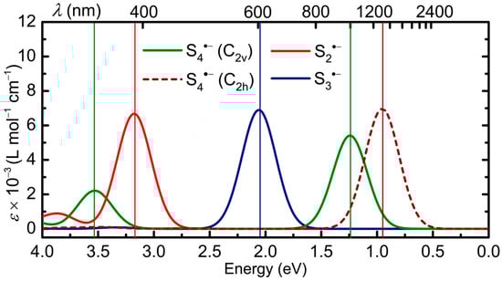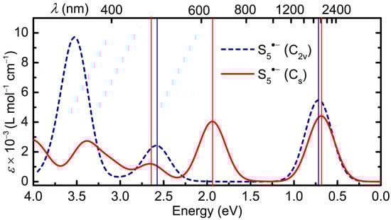 Calculated electronic spectrum of S5•− in DMF, in C2v and Cs symmetry, with HWHM = 0.18 eV; band assignments in Table 1.