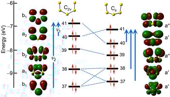 To resolve this difficulty, we examined the orbital make-up and electronic excitations found for the hypothetical planar variation with C2v symmetry. While it is considerably less stable than the Cs form, by virtue of increased lone-pair repulsions, its higher symmetry allows for a clearer evaluation of its spectral signature, particularly in relation to the HMO open-chain model developed above. Indeed, it is immediately apparent by inspection of the frontier orbitals illustrated in Figure 10 that excitations 40β → 41β and 38β → 41β listed in Table 1 correspond to the two lowest energy π → π excitations ν1 and ν2 predicted by the HMO linear chain model with N = 5 (Figure 6). As expected, ν1 lies deep into the near-IR (λmax = 1732 nm), extending the shift to lower energy seen in cis and trans S4•− (λmax = 998 and 1299 nm, respectively), with ν2 likewise red-shifted to λmax = 478 nm (from 351 nm in cis S4•−). The third, very intense excitation, from 39β → 42β, with λmax = 352 nm, is not related to the chain model, nor even to a π → π transition, but is rather a lone-pair σ → σ process arising from the artificially enforced planarity of the structure.