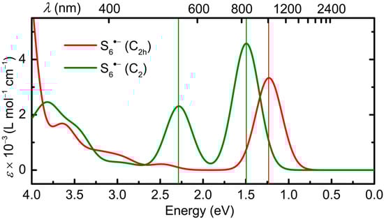 Calculated electronic spectrum of S6•− in DMF, in C2h and C2 symmetry, with HWHM = 0.18 eV; band assignments in Table 1.