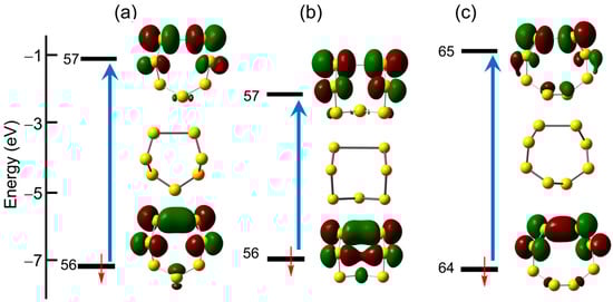 Unrestricted TD-DFT frontier orbitals and calculated σ → σ* electronic excitations found for the (a) chair and (b) boat conformations of S7•− and (c) the C2-distorted crown structure of S8•−.
