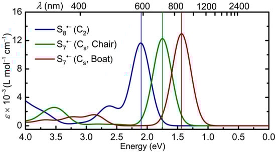 While the colors of S2•− and S3•− are well characterized, the optical properties of the larger putative polysulfide radical anions have been explored only to a very limited extent. Fabian et al. used density functional theory (DFT) methods to probe the excited states of S4•−, and predicted a strong absorption in the near-IR region, with a weaker band near 350 nm for cis S4•−(C2v) isomer, which is slightly more stable than the trans (C2h) isomer []. More recently, and using DFT and CASSCF methods, Rejmak confirmed that the cis S4•− radical anion could be identified by a strong absorption in the near-IR region [] and proposed that the red chromophore in ultramarine red is neutral S4 rather than the corresponding radical anion. Surprisingly, the excited state properties of the remaining radical ions in the series, that is Sn•− (n = 5–8), have never been explored theoretically, perhaps because even their ground state geometries have remained somewhat of a puzzle.