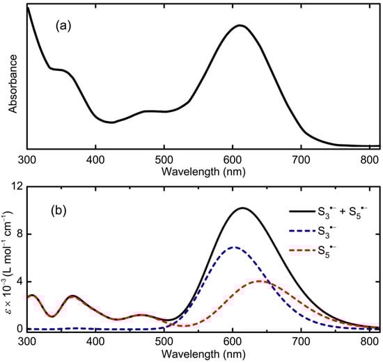 (a) Optical spectrum of 0.001 M solution of [Mn(N-MeIm)6][S8] in N-MeIm, reproduced from []; copyright American Chemical Society. (b) Calculated composite spectrum, with HWHM = 0.18 eV, for equally weighted mixture of S3•− and S5•− in DMF.