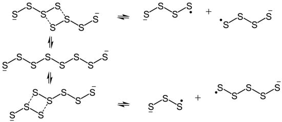 The larger anions Sn•− (n = 5–8) are also acknowledged as potentially important intermediates in the S8 ↔ S2− redox processes, as in the electrochemical reduction of cyclo-S8, redox transformations in alkali metal-sulfur batteries [] and the formation of polysulfides from photoexcited quantum dots [,]. Exploration of the stepwise electrochemical reduction of cyclo-S8 in non-aqueous solvents has been extensively pursued, with formation of S82− generally accepted by the battery community to occur first (Scheme 1) []. Initially, in 1970, Merritt and Sawyer claimed the preliminary formation of the one-electron reduction product S8•− [], then revised this interpretation to a two-electron transfer [], in agreement with the work of Bonnaterre and Cauquis [] and also supported by results obtained by Hardacre and coworkers using ionic liquids as the solvent medium []. However, in 2008, the results of a detailed cyclic voltammetric study of the reduction of S8 in various solvents were consistent with the formation of S82− via two consecutive one-electron steps []. The potential for the involvement of S4•− in the S8 reduction process has been argued [,,,], but in the absence of a clear spectroscopic signature for the anion, the issue has not been resolved. Although symmetrical dissociation of S82− to give two S4•− radical anions is calculated to be exergonic [], and an absorption band at ca. 700 nm was assigned to S4•− [,] in spectrochemical studies of the reduction of sulfur in DMSO and DMF, others insist that it has never been detected [].