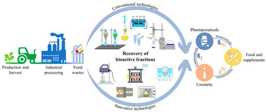 Agri-food industries create high volumes of organic waste (biomass), reaching up to 140 billion tons per year [1]. While a considerable portion of this waste is unrelated to food wastage issues [2], its disposal poses costs for food processors and has a negative impact on the environment. However, recovering value-added compounds, such as polyphenols, anthocyanins, tannins, and vitamins from agri-food residues represents a formidable challenge [3], as this can enhance the sustainability of food industry production, create economic and social benefits, and mitigate environmental burdens [4]. The concept of the zero-waste economy advocates for utilizing waste as a raw material for novel food products, ingredients, and applications [5]. Figure 1 schematically illustrates the recovery of bioactive fractions through conventional and novel technologies and their consequent valorization as natural additives or active ingredients in various sectors [6], including food, cosmetics, and pharmaceuticals [7].