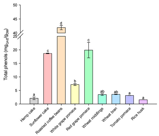 Total phenol content of extracts obtained after SLE extraction at 25 °C from agri-food residues after 24 h of diffusion. Different letters above the bars indicate significant differences among the mean values (p < 0.05).
