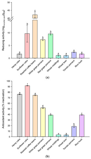 Chlorogenic acid and quercetin-3-glucoside were the predominant phenolic acids in all agri-food residues. The antioxidant capacity of the extracts was evaluated using ferric-reducing antioxidant power and inhibition percentage, which were assessed by FRAP (Figure 4a) and DPPH assays (Figure 4b), respectively.