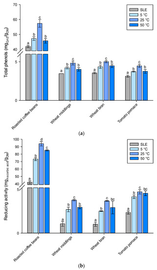 (a) Total phenols and (b) reducing activity of agri-food residue extracts obtained through (