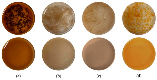 Visual observations of (a) roasted coffee beans; (b) wheat middlings; (c) wheat bran; and (d) tomato pomace in water suspension. First row indicates agri-food residue suspensions after HSM treatment; second row indicates agri-food residue suspensions after HPH treatment.