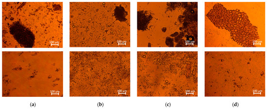 Brightfield micrographs of (a) roasted coffee beans; (b) wheat middlings; (c) wheat bran; and (d) tomato pomace in water suspension. First row indicates agri-food residue suspensions after HSM treatment; second row indicates agri-food residue suspensions after HPH treatment.