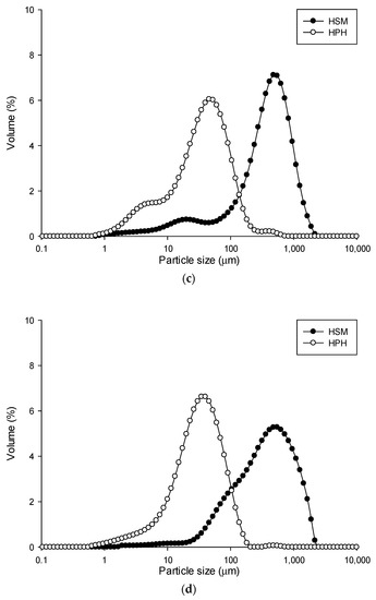 Both mechanical methods, HSM and HPH, led to smaller particle sizes compared to non-micronized samples. Notably, the smallest particle sizes were observed when HPH was applied to the agri-food residue-in-water suspensions.