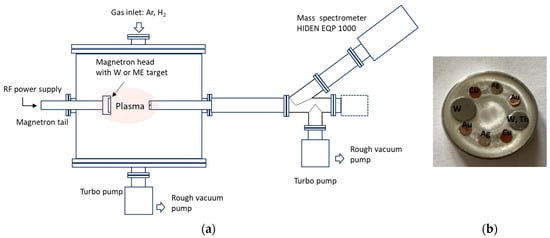 The schematic view of the experimental setup is presented in Figure 1a. Plasma is generated in a cylindrical chamber, in which a base pressure of 10−3 mbar is ensured by a combined roots and fore pumping system. A Torus magnetron (Lasker Co.), equipped with a 1-inch target, is powered by an RF generator (AD-TEC, AX series, 13.56 MHz) via an automated matching box (AD-TEC, AMV-1000-EN). A unit of gas admission and control made of two mass flow controllers (Bronkhorst) supplies the discharge with independent flows of Ar and H2. The two working gases are introduced into the discharge sideway, close to the magnetron target. The experiments reported here are carried out with an Ar or Ar/H2 mixture (1:1 ratio), using an RF power of 80 W, at a total pressure of 7.2 × 10−2 mbar.