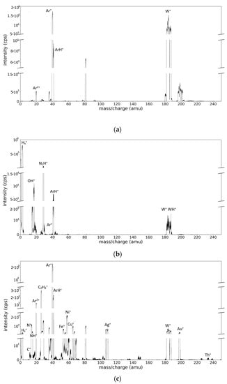The spectrum obtained from the ME target (Figure 2c) presents similar features, but is much richer in peaks. For example, the peaks corresponding to Cu+ (one dominant isotope, 62.93 amu), Ag+ (two isotopes at 106.905 and 108.904 amu), Au+ (one isotope at 196.996 amu), and Th+ (one isotope at 230.035 amu) are clearly separated. In addition, the presence of Ni, Cr, and Fe species is noticed, with their origin being attributed to the sputtering of the stainless-steel-made magnetron shield.
