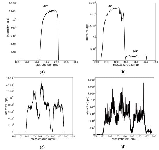 Well-isolated peak profiles presenting the asymmetric flat/trapezoidal shape of the (a) Ar2+, (b) Ar+, and ArH+ species. Mass spectra in the region of W, illustrating the superposition of isotope peaks, recorded for (c) W/Ar and (d) W/Ar/H2 plasmas.