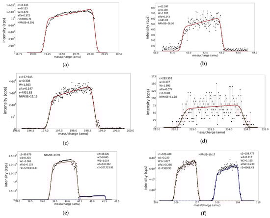Fit (continous lines) of the well-isolated peaks in spectrum (recorded black points in the figures) on multielement target (a) Ar2+, (b) Cu+, (c) Au+, (d) Th+, (e) Ar+, ArH+, and (f) Ag+. The fitting procedure used for multielement spectra involved the varying of all five parameters for each peak present in the spectrum.