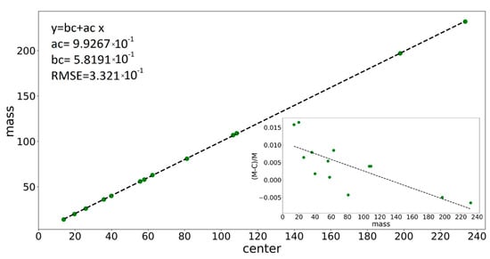 The variation in peak center with (m/z)real of the associated species, and in the inset, the dependence of measurement errors on (m/z)real value for various peaks in the ME spectrum together with the linear fit parameters and the RMSE value (the green points represent the experimentally measured mass values).