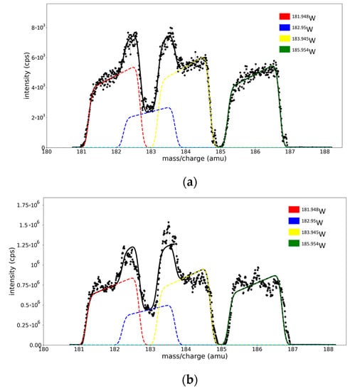 With respect to the W mass region (Figure 3c,d), the assignation of the peak positions is far more difficult [14,15]. The specific limitation to this process is the superposition of the peaks. W has five isotopes, whose mass values and natural abundances are presented in Table 2. The peak superposition combined with the shape profile and the inherent noise makes a simple interpretation of the spectrum almost impossible (see Figure 3c). An additional difficulty appears in the case of hydrogen contamination or hydrogen–tungsten plasmas due to the small signal affected by noise and possible contributions of newly formed molecular WH+ species (Figure 3d).