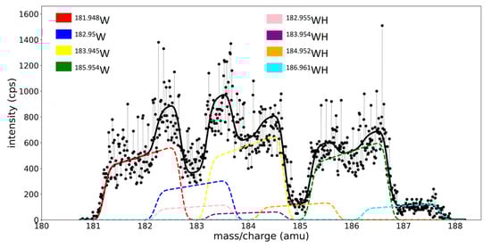 The spectra from the magnetron discharge in the Ar/H2 gas mixture have at least eight peaks in the W region, i.e., from the isotopes of tungsten and their molecular combination with hydrogen (hydrides, WH). Some of the WH peaks are centered in almost the same positions as the metallic W peaks, which makes peak separations difficult. Therefore, we used the calibration parameters to fit this spectrum (Figure 7): the peaks are centered in the expected m/z position, and the widths and obliquity parameters are fixed using the calibration lines. Because there is no physical reason for some of the isotopes to react selectively with hydrogen, the isotopic composition of the WH+ species must respect the isotopic composition (natural abundances) of the W+ species. By considering the NA of W+ and WH+ as fixed values, the need of having the area of each peak as a fitting parameter is essentially removed. Only two variable parameters, R and RH, enter the spectrum model function, S(x, R, and RH), where these parameters scale the fitted curve to the envelope of W+ and WH+ recorded superposed peaks.