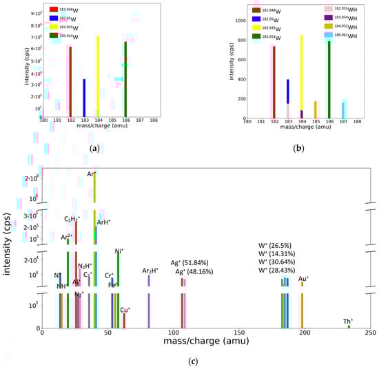 Bar representation of mass spectra: (a) for the W peaks of W/Ar, (b) W/Ar/H2 spectra, and (c) integral spectrum of the ME target.
