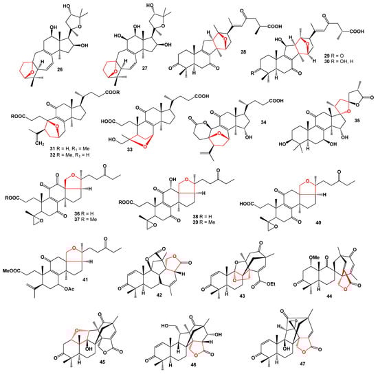 An intriguingly rearranged hexanorlanostane, known as cochlate C (34), was obtained from the fruiting bodies of Ganoderma cochlear [55]. Additionally, Ganoderma tropicum and G. boninense, two medicinal mushrooms, yielded a steroid (35) and a series of secolanostanes (36–41, 3D graph, see Figure 8) with anti-plasmodial activity [56,57,58]. Furthermore, the fungal strain Emericella sp. TJ29, an endophyte derived from the root of Hypericum perforatum, produced several extraordinary meroterpenoids named emeridones A–F (42–47) [59].