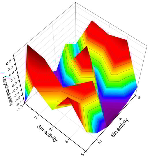 Three-dimensional graph illustrates the predicted and calculated antiprotozoal (Plasmodium) activity of the vilasinin-type limonoids (106, 107, 108, and 109) with a confidence level exceeding 95%. These limonoids are derived from the tree Trichilia gilgiana, which is predominantly found in southern Nigeria and eastern Congo. In the Congo region, the extract of Trichilia gilgiana bark is utilized for its analgesic and stimulant properties. It has been traditionally used in traditional medicine to treat abdominal pain, chest pain, fever, and as a tonic. The juice of the young leaves is applied to circumcised wounds, while crushed leaves are added to drinking water for the treatment of respiratory diseases. Additionally, the juice of the leaves has demonstrated potent activity against the malarial Plasmodium [123,124,125].