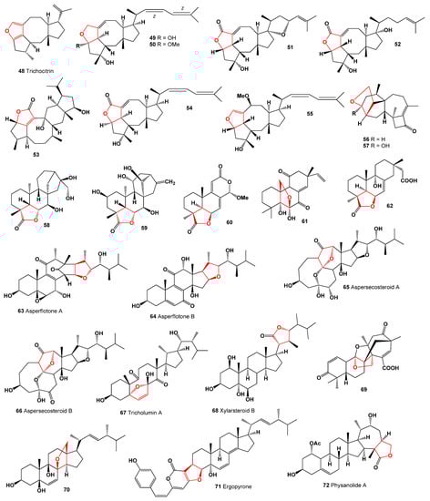 Xylarglycoside B (68), an antibacterial steroid, was isolated from the fungus Xylaria sp. KYJ-15, which was derived from the leaves of Illigera celebica. It displayed antibacterial activity against Staphylococcus aureus [78]. The endophytic fungus Emericella variecolor led to the isolation of emericellic acid (69), a meroterpenoid compound [79]. From the fruiting bodies of the mushroom Stropharia rugosoannulata, an unusual sterol with an unprecedented ether ring (70) was isolated. This mushroom is known as saketsubatake in Japanese and wine-cap stropharia in English [80]. Ergopyrone (71), an extraordinary styrylpyrone-fused ergosterol derivative, was isolated and structurally characterized from the mushroom Gymnopilus orientispectabilis. This steroid features a hexacyclic 6/5/6/6/6/5 skeleton that is formed via [3 + 2] cycloaddition between ergosterol and styrylpyrone precursors [81].