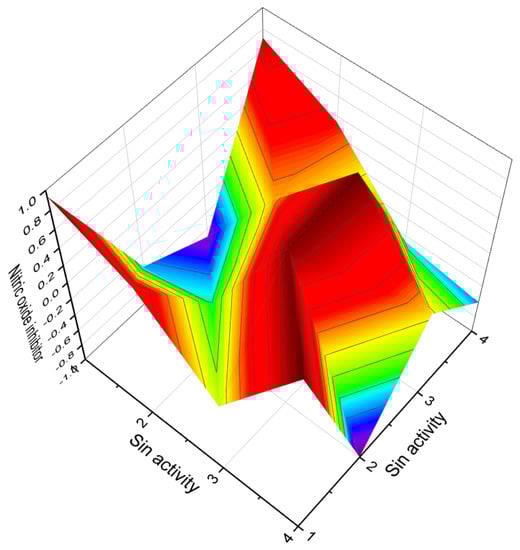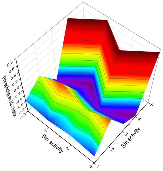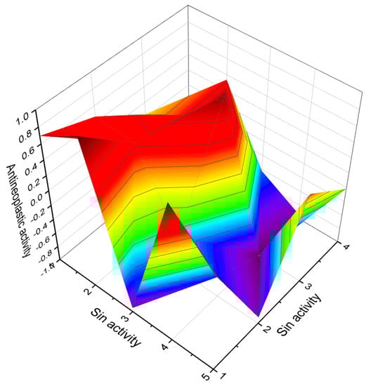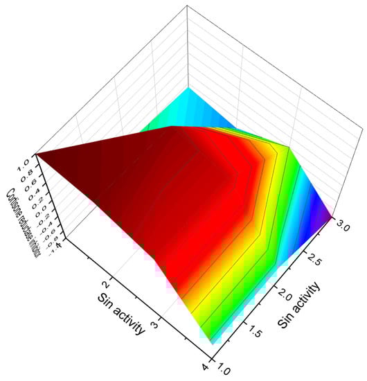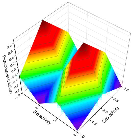 Three-dimensional graph illustrates the predicted and calculated activity as inositol-3-kinase inhibitors for steroids 7, 8, and 10 produced by the endophytic fungus Talaromyces wortmannii. The graph demonstrates a high confidence level of over 94% in the activity predictions. According to the data from Table 1, the dominant activity of steroids 7, 8, and 10 in the graph is shown in red. The steroid wortmanolone (7) is an antineoplastic and inositol-3-kinase inhibitor. The steroid wortmannin A (8) is an inositol-4-kinase inhibitor and inositol-3-kinase inhibitor of activity, and steroid secovironolide (10) is an inositol-4-kinase inhibitor and inositol-3-kinase inhibitor of activity. The activity text is in red for the steroid wortmanolone; in black is the activity of the steroid wortmannin A; and in blue is the activity of the steroid secovironolide. Red color—strong activity, blue color—no activity.