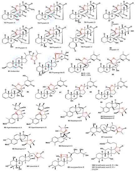 Bioactive compounds 83–99, known as withaphysalins, were isolated from Physalis minima. These compounds typically possess a hemiacetal or lactone linkage between C-18 and C-20, and they have demonstrated cytotoxic, antiproliferative, and anti-inflammatory activities [86,87].
