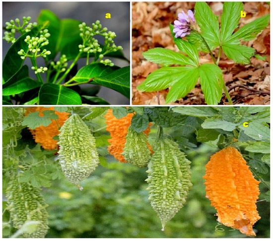- Jia, S.; Shen, M.; Zhang, F.; Xie, J. Recent Advances in Momordica charantia: Functional components and biological activities. Int. J. Mol. Sci. 2017, 18, 2555. [Google Scholar] [CrossRef]