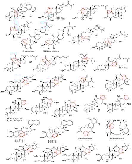 Walsura cochinchinensis bark extract yielded two limonoids, walsucochinones B (116) and C (117). The ethyl acetate extract and walsucochinone C (117) displayed cytotoxic activity against MCF-7 human breast cancer cells [114]. Melia toosendan (Meliaceae) root bark provided spirosendan (118), a skeletal limonoid with a spiro-structure [115]. Additionally, an aqueous methanolic extract of Cedrela odorata leaves yielded four tetranortriterpenoids: cedrodorin (119), 6-acetoxycedrodorin (120), 6-deoxy-9R-hydroxycedrodorin (121), and 9R-hydroxycedrodorin (122) [116].